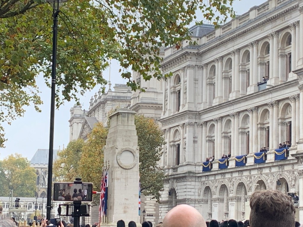 Sunday was the official celebration of Remembrance Day in London.There was much pomp and ceremony with 10,000 people with military or paramilitary affiliation and they marched toward the cenotaph.The streets were lined layers thick with crowds.You needed to pass through security to get close.There were marching bands and bagpipes.Many people were there to see the Royals and a cheer would go up from the crowd as the king passed their location.